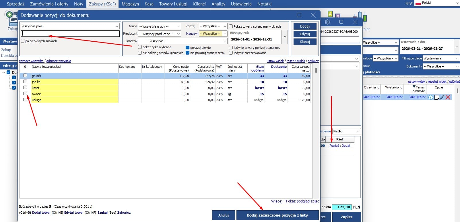 W przypadku wybrania opcji powiąż otworzy się nowe okno z kartoteką towarów. Można znaleźć wybraną pozycje poprzez wpisanie jej nazwy w polu szukaj. Przy wybranej pozycji należy zaznaczyć kwadracik oraz kliknąć dodaj zaznaczone pozycje z listy: