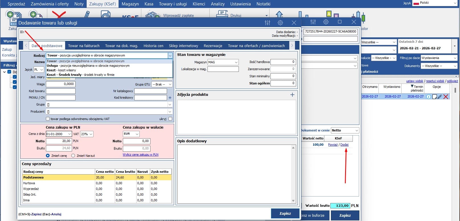 Kliknięcie przy pozycji opcji dodaj spowoduje otwarcie nowego okna, w którym będziemy mogli wybrać czy dana pozycja ma być towarem, usługą, kosztem własnym czy też kosztem – środkiem trwałym: