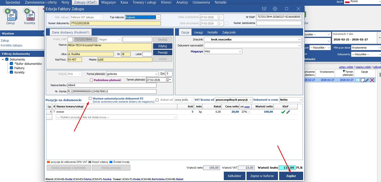 Jak już powiążemy lub dodamy wszystkie pozycje i chcemy by stany magazynowe się zmieniły, zaznaczamy opcję wystaw automatycznie dokument PZ. Następnie należy zapisać dokument: