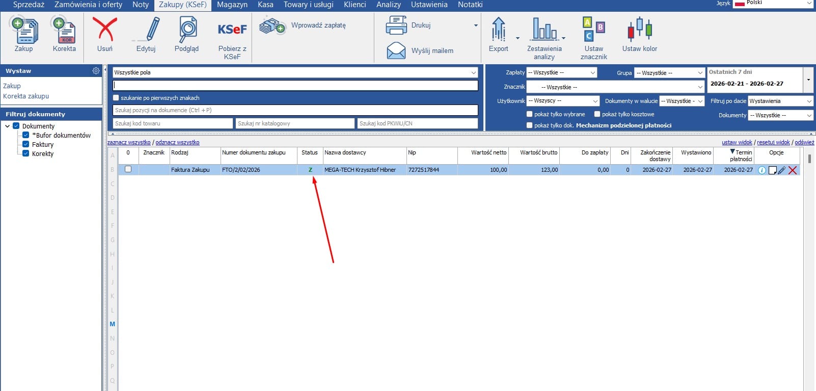 Po poprawnym zapisaniu dokumentu zmieni się status z litery „P” na literę „Z”: